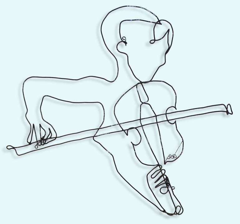 This is a portrait of a girl playing a violin. It is made out of 9 gauge (about 4 mm diameter) low carbon steel wire that I bend by hand and weld, then powder coat gloss black with a weather resistant material. It is easily installed.inside or outside permanently or temporarily on anchors according...
