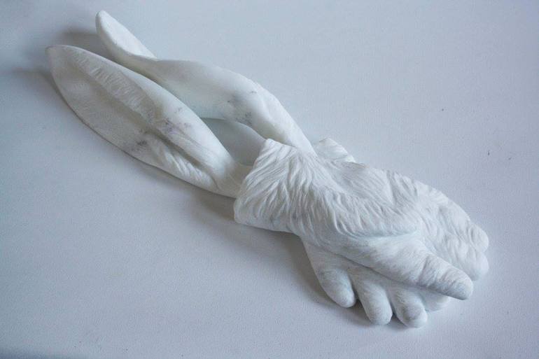A sculpture carved from marble showing fur gloves with rabbit ears ornament.