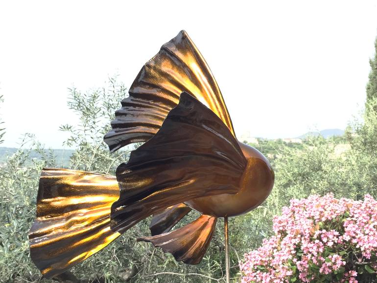 Gold fish made in metal and fiberglass, resin , metalic peinting, varnish. unique piece