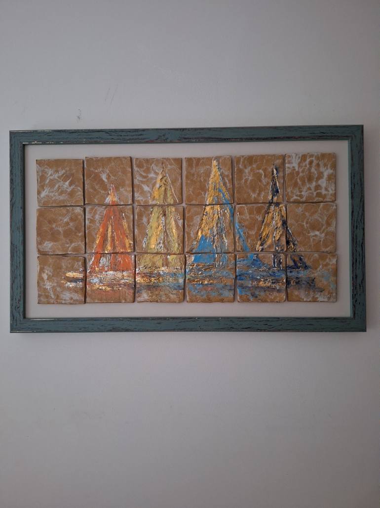 Regatta on ceramics and gold decorations on it. I have used coloured slips on clay and after bisc firing I applied transparent glaze. After firing, I have decorated tiles with gold leaf. When I was younger, I used to watch the Regattas and I remember the joy and excitement that complimented the sce...