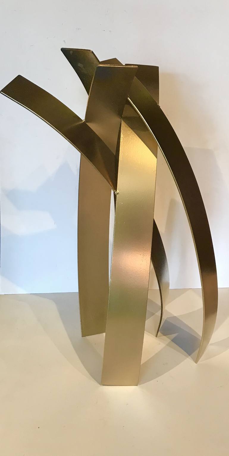 This is a further continuation in the exploration of abstracting Prairie Grasses. This particular sculpture is painted a bright gold. It is directly inspired by the movement of wheat fields in the breeze.
