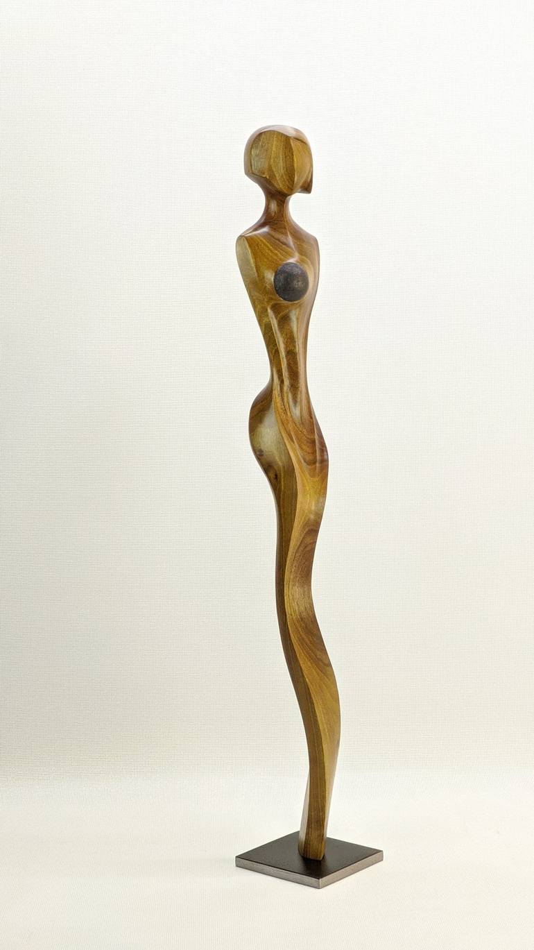 When I created this sculpture, I wanted to explore feminine strength and elegance in a way that feels timeless and universal. The elongated form, crafted from warm walnut wood, flows gracefully with subtle lines that evoke movement and vitality. The metal base and forged iron details add contrast ...