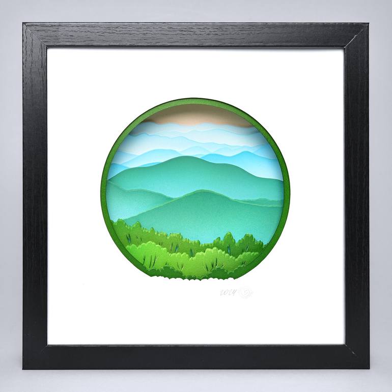 Embark on a journey through the timeless beauty of the Great Smoky Mountains with this captivating artwork. Crafted with precision by artist Olga Skorokhod, it's a layered hand-cut paper sculpture that transports you to the tranquil vistas of summer. Layers of mountains stretch infinitely, their hue...