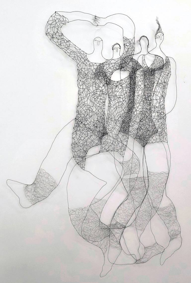 People get together to socialize and talk. "Group" sculpture-drawing (wire drawing) talks about being connected and about enjoyment of meeting others. Individual is transformed into the aim of all.