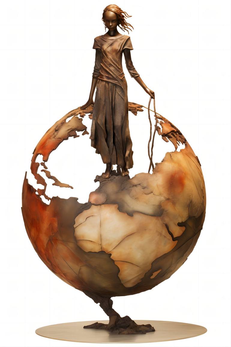 This sculpture depicts a girl standing on a large Globe with a rope in her hand, symbolizing her attempt to save the world. The girl's posture is erect and her expression determined.The patina on the bronze gives the piece an aged look, adding a sense of timelessness to the message it conveys. “Gua...