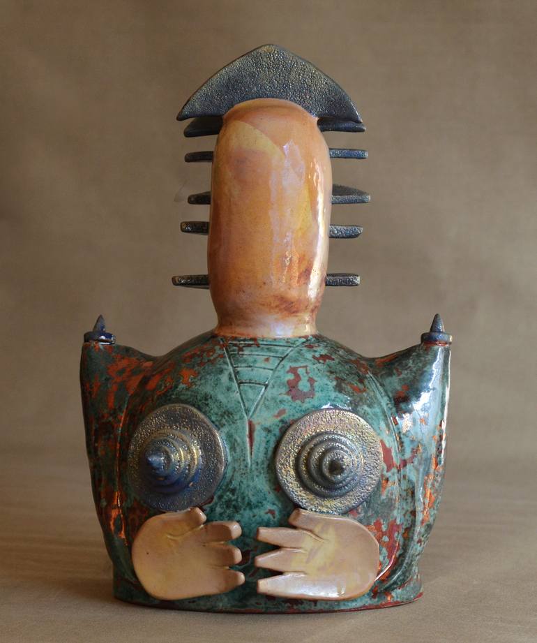 Scultura in ceramica forgiata a mano e decorata con la tecnica "Lustro Persiano" Anima guerriera in lotta contro la violenza della guerra. Trasforma la sua fisicità per salvaguardare la sua maternità, forza vitale e naturale dell'umana esistenza.