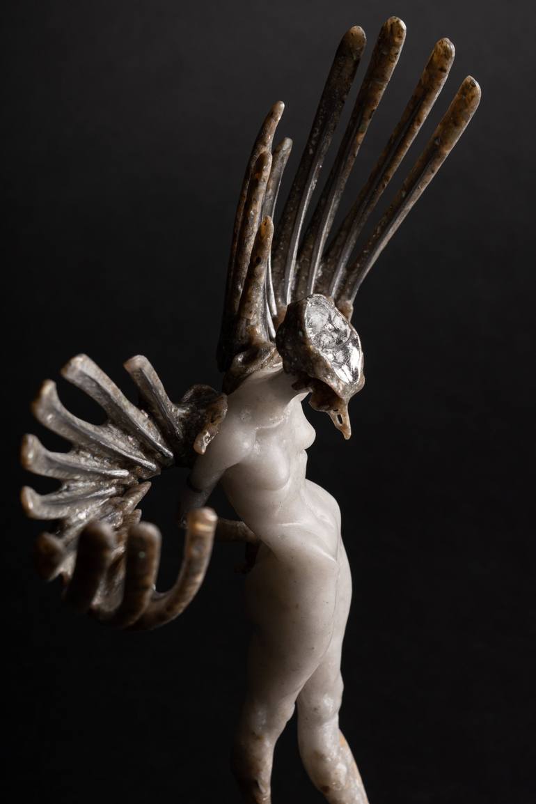 The work, titled Hesidency, is a female figure with wings, a dove skull head and a stand. The female figure is a girl's body as a symbol of life and youth, but it is shackled. To reflect this, a hunched over shape with hands tied behind was chosen, the wings of the bone, which are directed downwards...