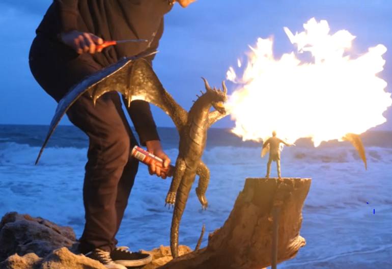 This is a handmade steel dragon sculpture that is positioned on a wooden jarrah base. On the other side of the base stands a handmade medieval metal knight sculpture. The dragon has a simple to operate inbuilt flamethrower system which is designed to shoot fire onto the knight. The dragon has an ada...