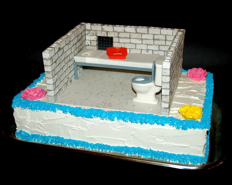 Shortly after Mr. Madoff's verdict came down I started working on this piece. His prison number is actually on the orange jumpsuit on the bed. I figured after 150 years the pastry chef at the prison would make him something like this!. Concrete, cement, steel, polystyrene, porcelain, cotton, lin...
