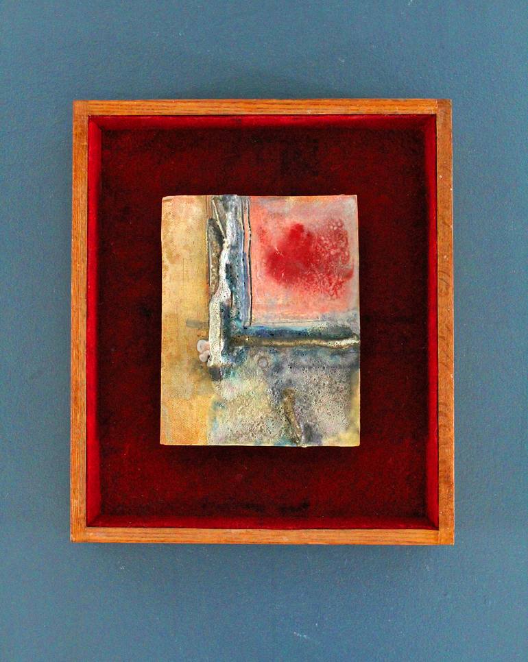 This ceramic wall tile has been enclosed in a frame of finished hardwood and red felt as a means of embracing the work as an archeological relic. The tile is composed with both sculptural and painterly features which contrast with the clean lines of its case which is fabricated from finished hardwo...