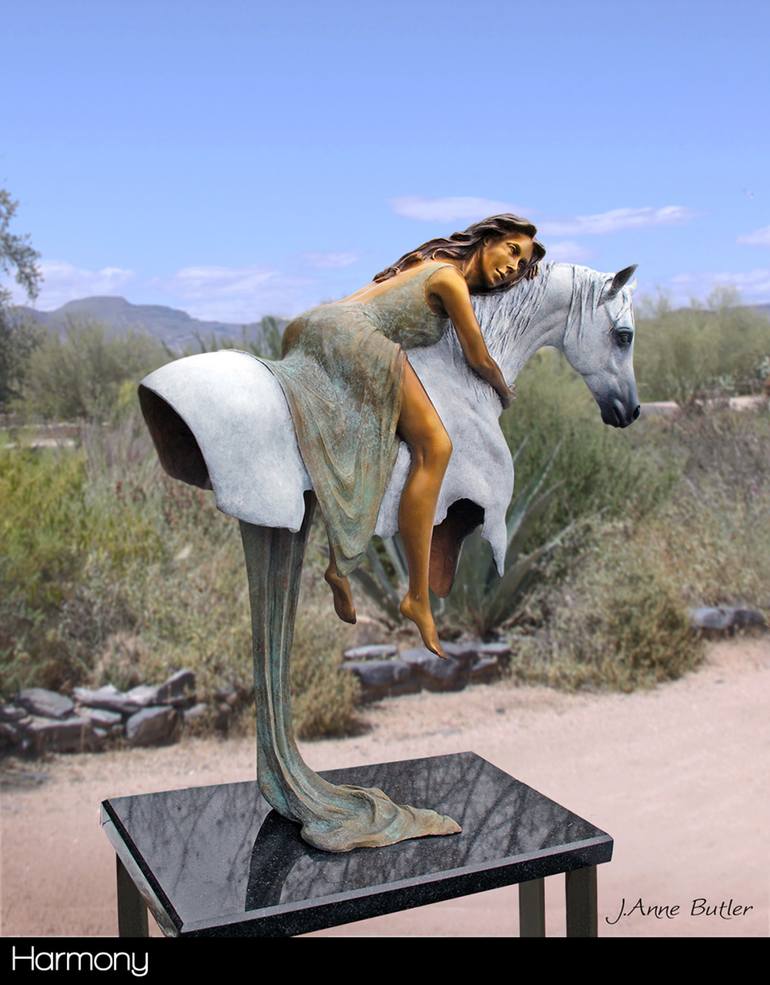 Harmony incorporating the female form into this outstanding equestrian bronze statue shows the true relationship between girl and horse. Figurative artist, J. Anne Butler captures the true spirit in this horse statue that is so much more a bronze sculpture.