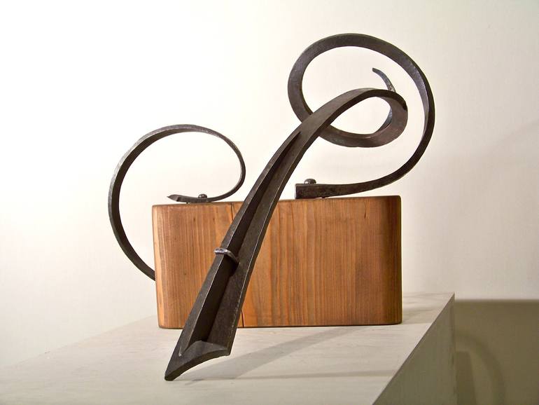Free hand forged sculpture made of steel and wood. All elements were heated up to 1200 Celsius degrees in open coal forge and shaped by hammer blows . This modern sculpture is made with craftsmanship precision and is full of organic lines and free open form which gives a feeling of eternal movemen...