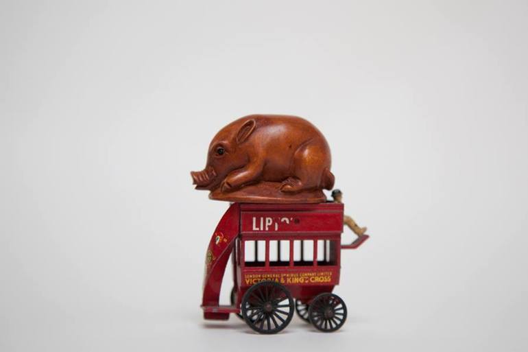 A hog rides on top of a small red bus in this sculpture––or juxtapose––created from found objects.