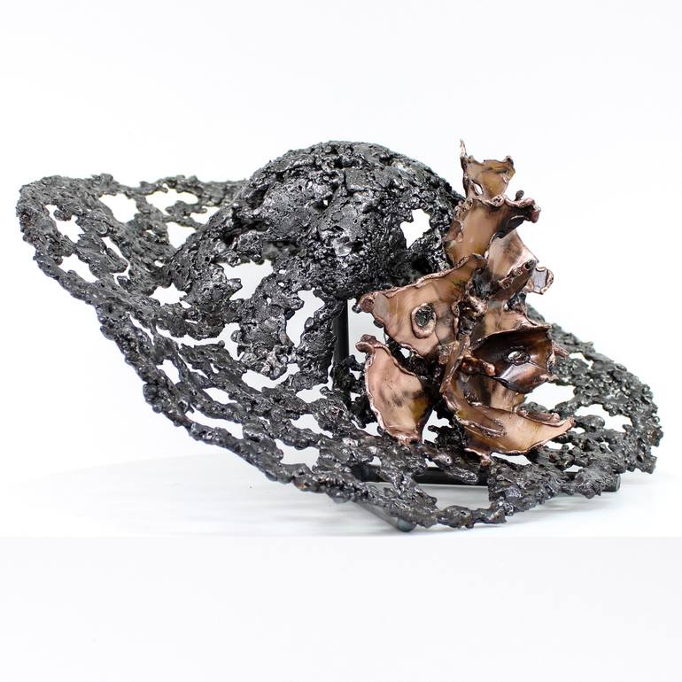 Sculpture representing a hat in metal lace steel and bronze. The metal lace is obtained by dripping, melting the metals drop by drop, which guarantees that each sculpture is unique. The flowers that adorn the cap are made in bronze. This sculpture is presented and sold with a removable metal stand....