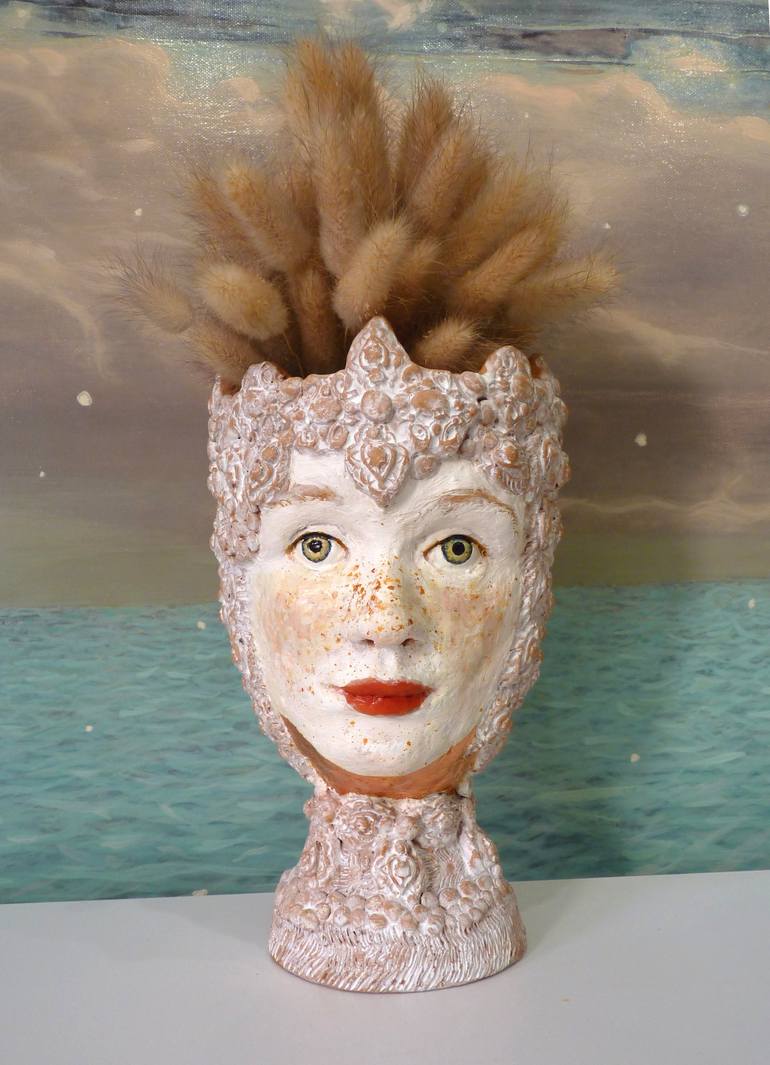 "He and she" is an original ceramic sculpture(vase). One of a kind. Title: "He and she" Material: white and red clay, metallic leaf foil, oil paint Size: 21 x 13 x 13 cm (approx. 8.2 x 5 x 5 in) Year: 2023 This is decorative indoor art sculpture. You can put inside a dry plants or bird feathers, ...