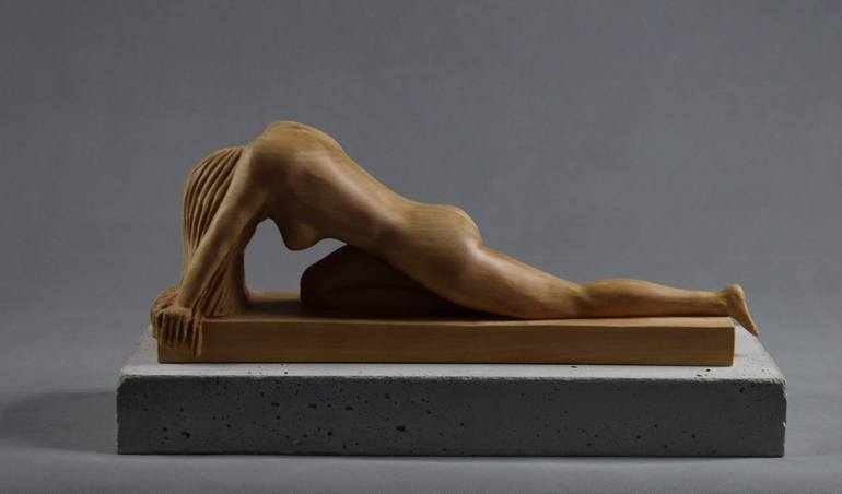 Based on a live model in my studio, I carved this timeless pose from a single block of English Lime-Wood. I find that the natural beauty of wood complements the soft curves of the feminine figure perfectly and the smooth finish invites the viewer to caress the sculpture, my photos don't do justice t...