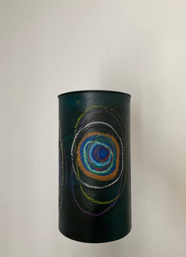 Cy Twobly and Alexander Calder's mobile's were my inspiration. I want the viewer to see the explosive energy it brings with the colorful strokes outside the circle that act as healing strokes. I chose a cardboard container with a plastic lid because of it's lightweight qualities and mobility. Hang...