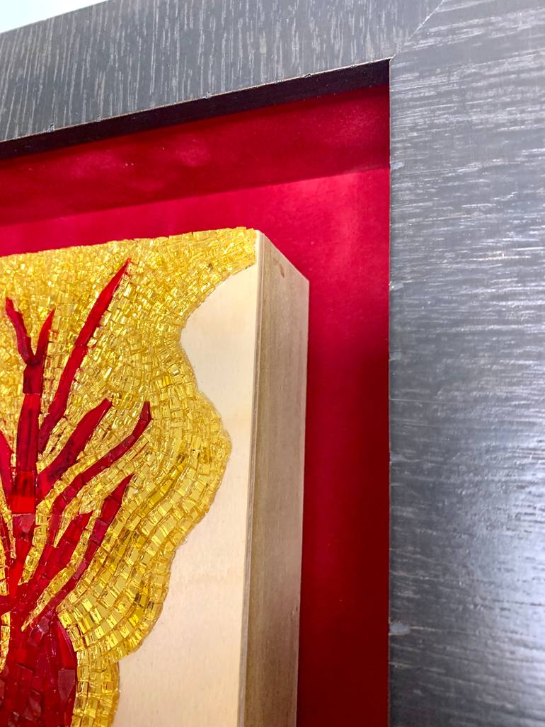 My heart is your heart. It is the heart of the world, the heart of the universe. At once human and divine, the heart expands with every beat, reaching deep within and without. It breathes compassion, love and mystery. A micro mosaic of red and gold glass on wood, framed with red velvet and textu...