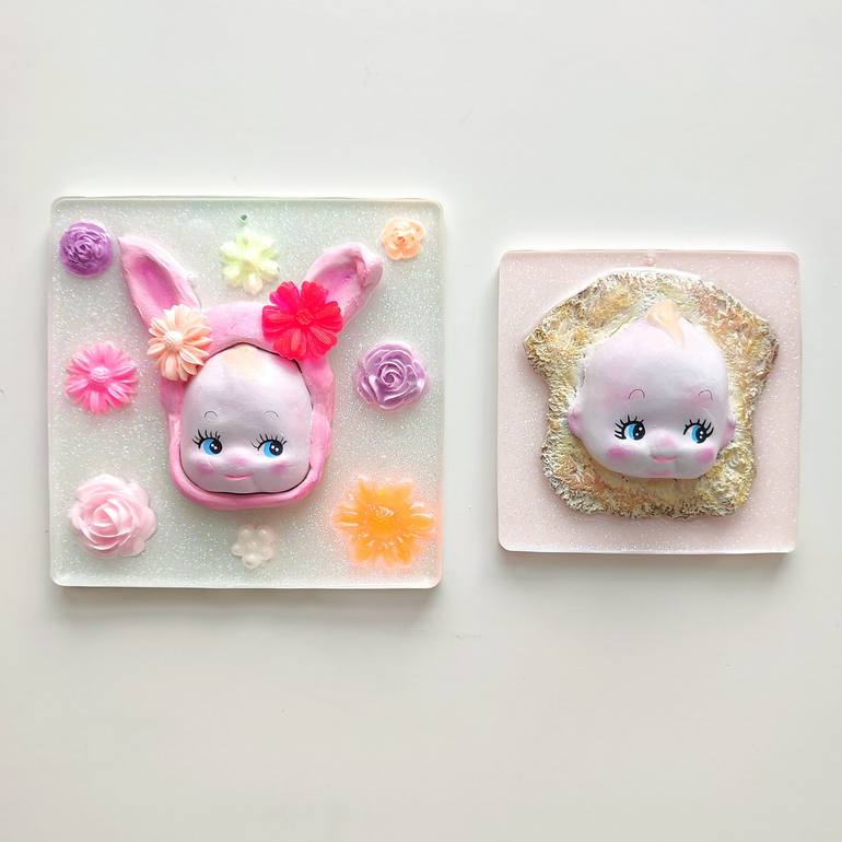 "Hellboy bunny and toast" SET OF TWO MOLDS New series inspired by the Kewpie and Sonny angel dolls. The dolls are molded and hand-painted in cold ceramic and encased in a resin tile. Even the flowers are made of resin You can hang them on the wall with a nail because they are fitted with a s...