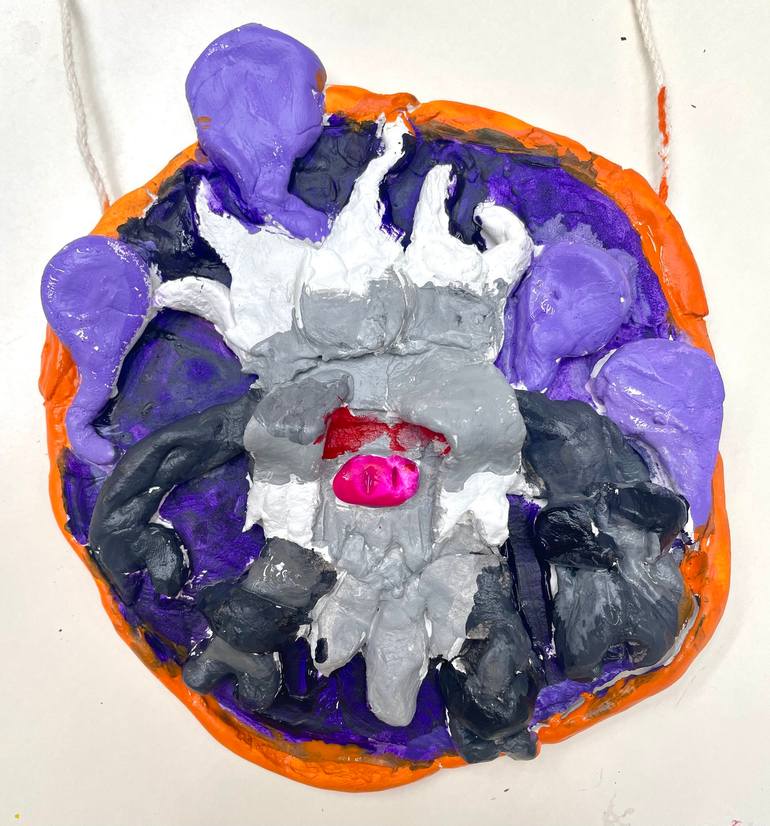 This Pokémon-inspired relief sculpture features Hisuian Zoroark in a circular design with a bold orange border. Miryu used fast and confident modeling techniques to form the shape and added layered coloring for clarity and contrast. The border color was chosen to frame and balance the inner characte...