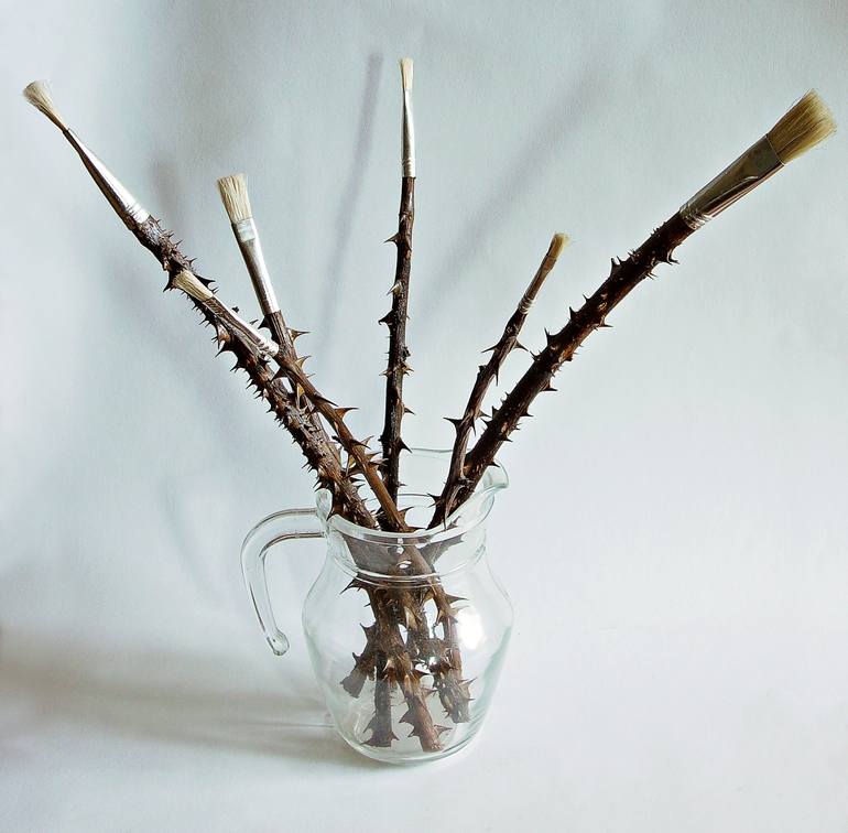 Paint brushes, rose stems and glass jug.