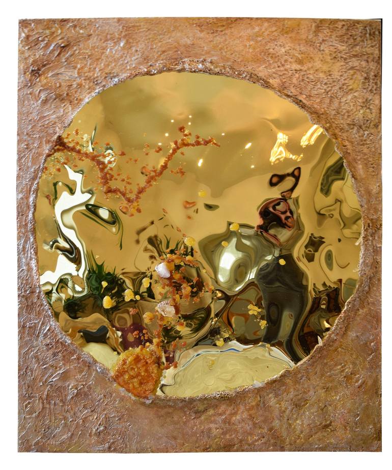 Color; Metallic Gold / Earth colors. You will get different shapes depending where you place your artwork. The sculpture comes to life near a source of light. The golden circle is fitted within a textured panel. The sculpture is embedded with natural crystals that got healing properties. Ready to...