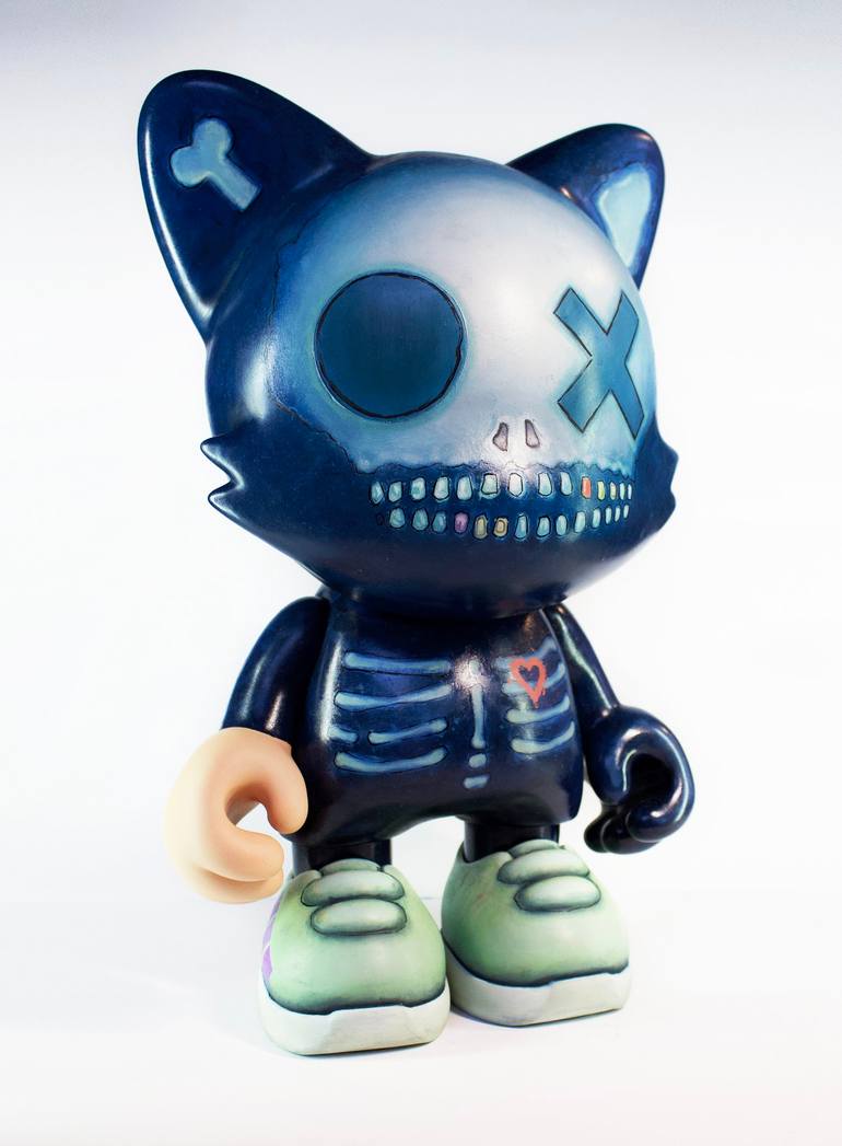 Oil and acrylic on vinyl The iconic character Janky in signature Strangerbot style, blends colors and layers of blues, creating depth with a floating skeleton. Of a half-ghost cat waiting for its owner.