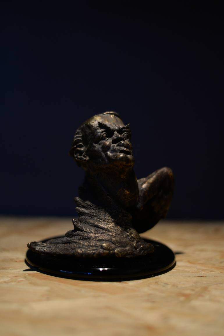 Bronze patinated and polished tridimensional sculpture representing ICAR. In author's vision it it represented diabolical, with broken wings as a punishment for his disobedience and naivete. Inspired from the Greek mythology: Icarus myth.
