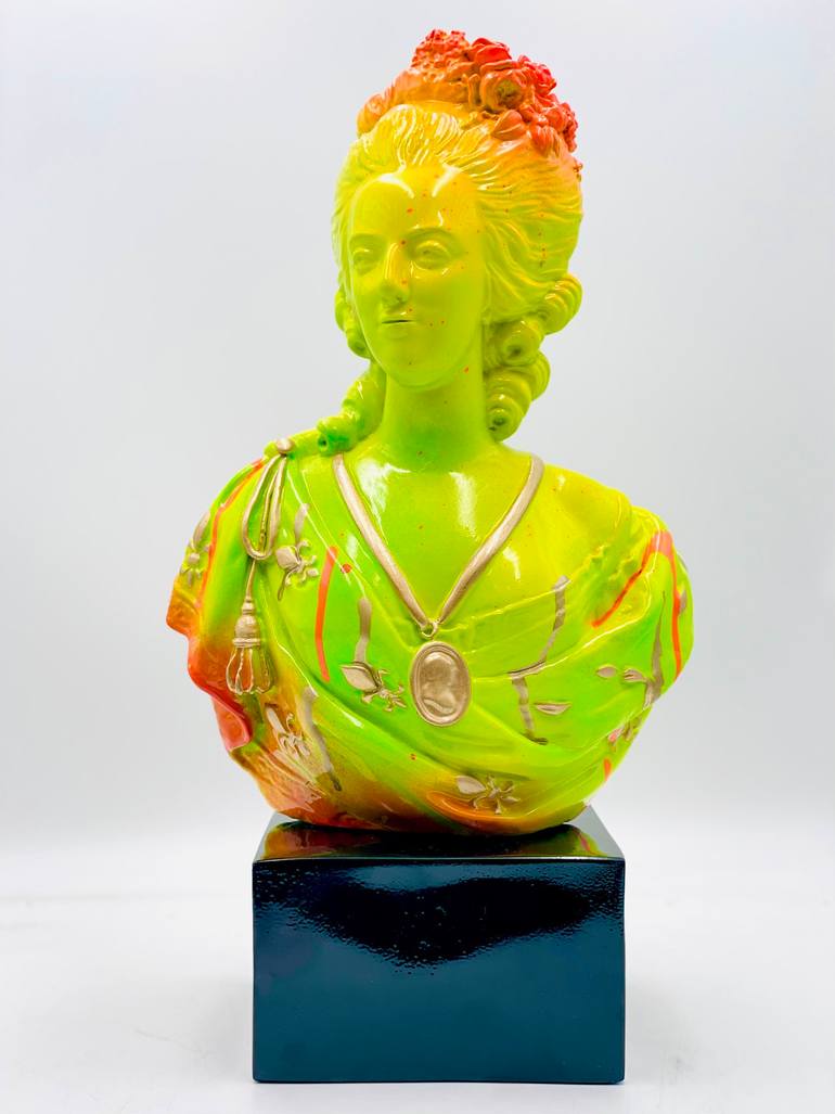This work is inspired by Marie Antoinette, a timeless symbol of luxury, elegance, and bold individuality. Her historical significance and iconic presence are reinterpreted through a modern lens, blending classical refinement with contemporary vibrancy. The neon yellow and green tones push the bounda...