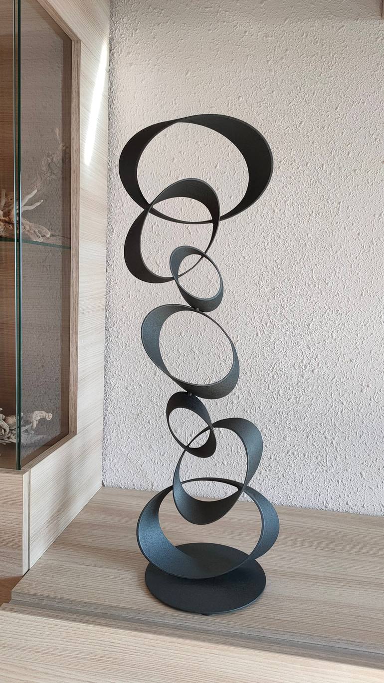 The sculpture "Equal but Different" is a piece that plays with circular forms in a vertical, harmonious arrangement. The design features a series of overlapping rings, each of different sizes and orientations, yet fluidly connected, creating a sense of movement and continuity. Circles, which traditi...
