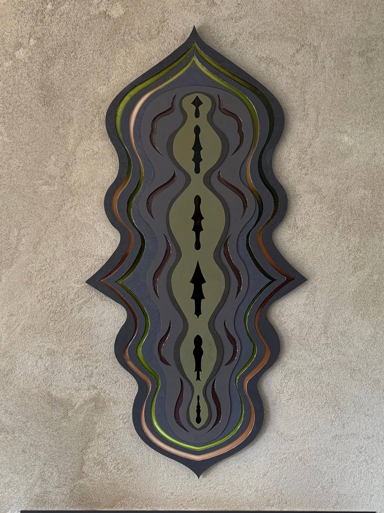 This piece is my dark moment. A dive into the deep nature, where there is darkness and a bit of shine where the sun hits the ground. Another of my rococo or vagina shapes. Or just me being in my symmetric mood. The black mirror reflection adds depth to the room where it is displayed. I would hang it...