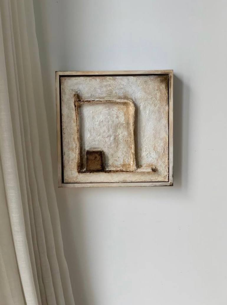 mixed media sculpture on canvas Framed in a solid wood frame which has been hand painted by the artist to make it flow with the artwork itself. My work is heavily influenced by my upbringing in a rural village... the textures and patina that naturally surrounded me. Old weather beaten wood doors ...