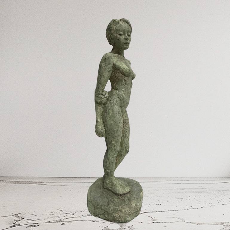 This figurative sculpture, created using a live model, embodies the serene essence of femininity. With her calm demeanor and understated beauty, the piece invites contemplation of inner strength and vulnerability. Crafted in the studio of renowned sculptor Tanya Ragir, the clay form is finished with...