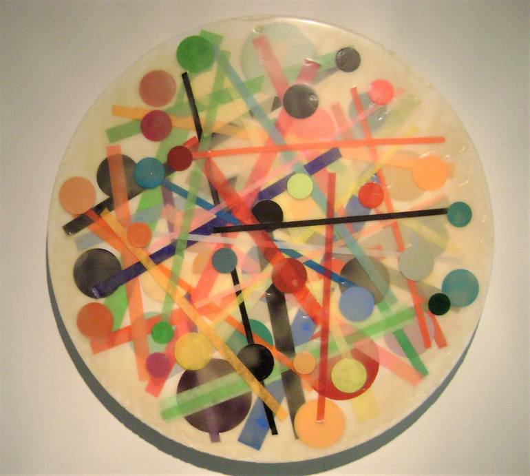 remember those fruit and carrot sallads embedded in yellow jello?well, heres my take.layers of hand cut shapes with multi layers of encaustic wax,resin coated at the end for durability