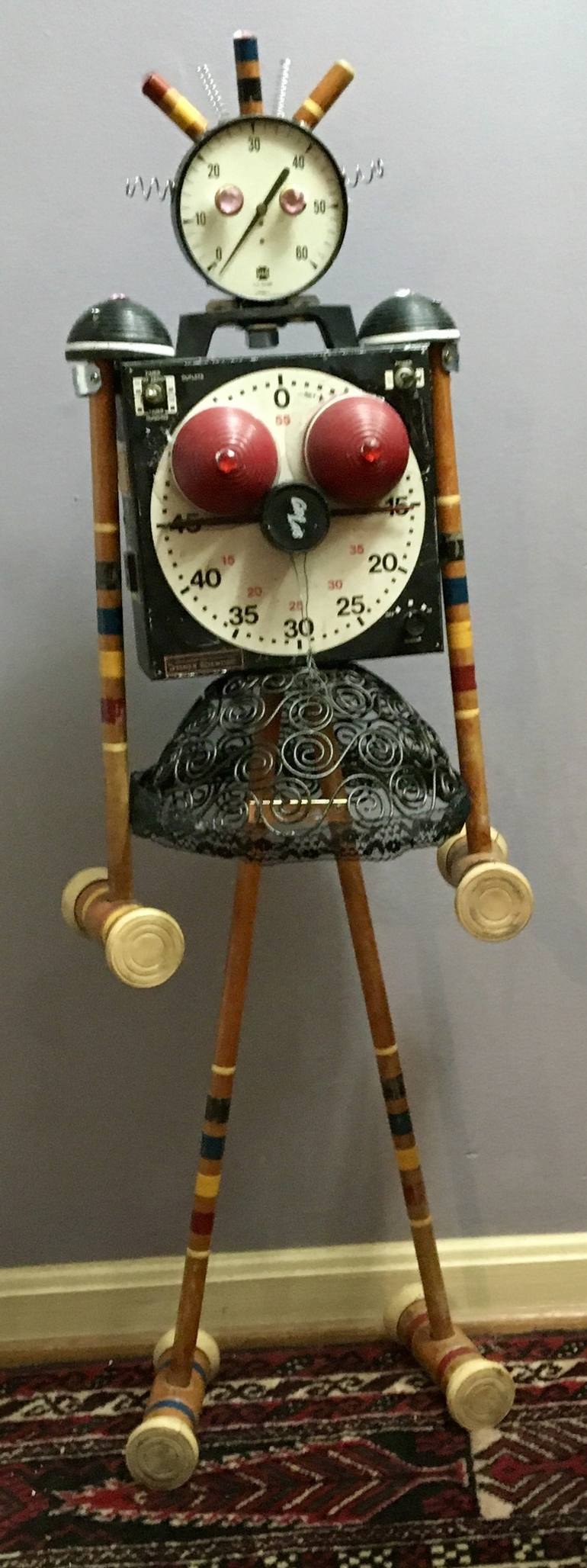 My friend gave me the photo clock it belonged to her father. Recently I found the skirt and I had the old croquet set at my has taken a while but I think it has come together I decided she needed additional body parts she seems to look at lot more interesting