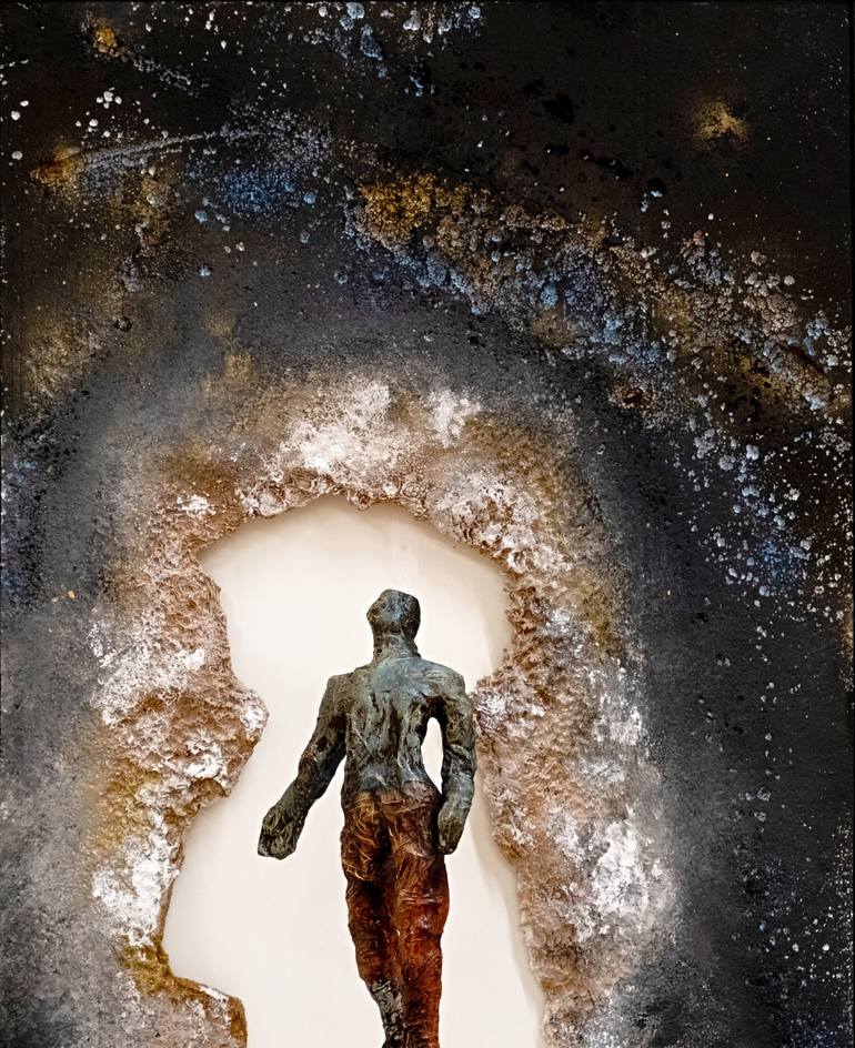 A striking mixed media artwork showing a solitary figure walking into a dramatic cosmic portal. The textured dark background with specks of gold, silver, and blue creates a celestial atmosphere, while the sculptural figure appears to be stepping into a light-filled void. The dynamic sculpture by He...