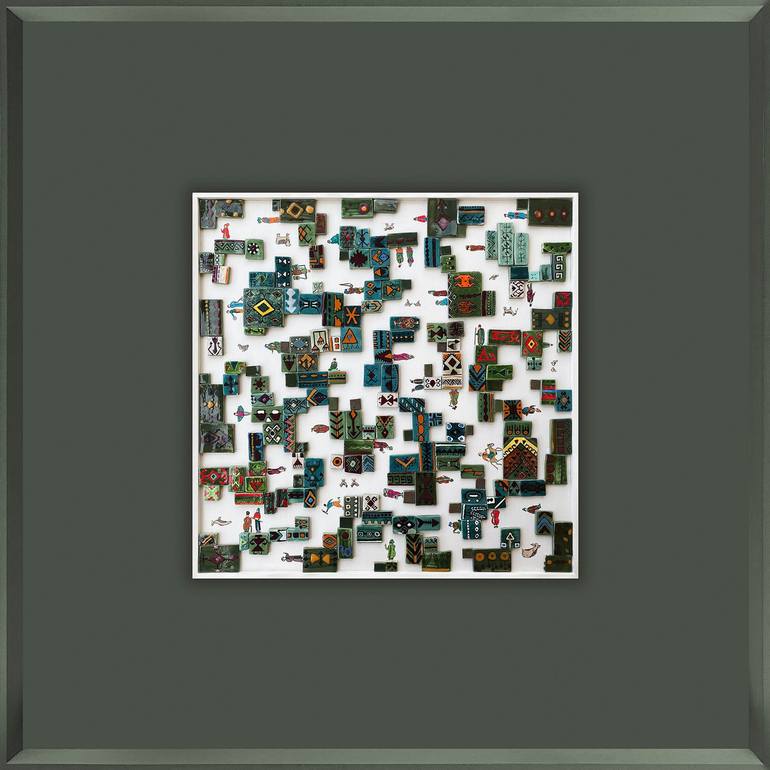 //Turkish rug motifs and Ottoman human silhouettes are used as particles describing the rhythm of an interlocking series of stories. The motifs are designed, drawn and painted separately for each tablet. Some of the motifs are “Eye (Göz) / Evil Eye (Nazarlık) Eye, Cross (Haç), Ram's Horn (Koçboynuzu...