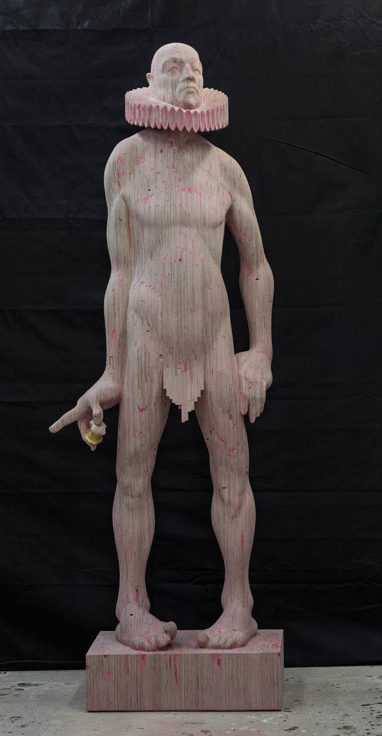 The figurative statue of a man with Hispanic collar possesses an apple core, the allegory of kingdom. Wood structure with acrylic inserts. Size: 270 x 90 x 53cm