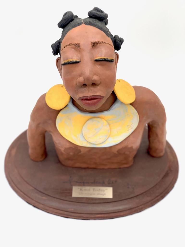 Knot Today is a one of a kind sculpture made of custom mixed polymer clay on a wooden stained base. Knot Today is inspired by the Bantu Knot hairstyle. This work speaks to natural hair in the African American culture and the African Diaspora. Stating that yes, I will Knot today my hair in it's na...