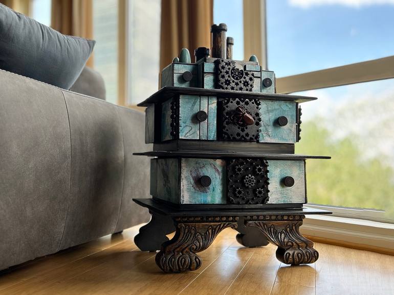 Kraken is a remarkable, multi-story wooden sculpture built like a steamship, with an intricate design that invites exploration. Standing on reclaimed old English claw feet, its imposing size—about the height of a couch—commands attention. The structure features multiple portals, doors, and hidden di...