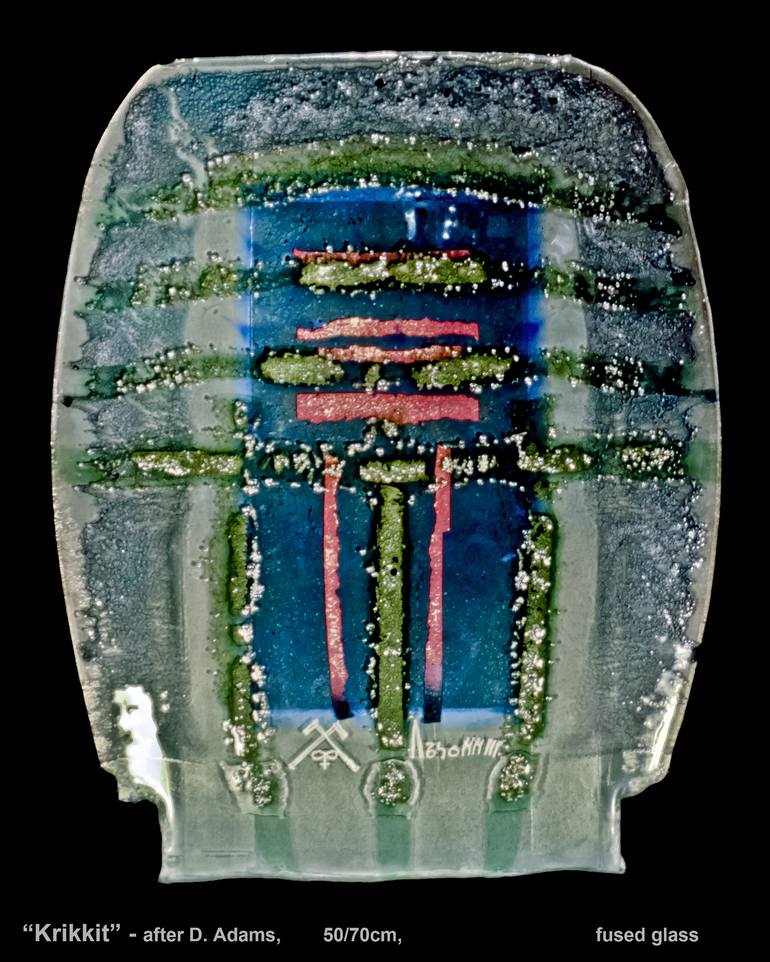 Inspired by story in one of the novels from the Hitchhiker's Guide to the Universe series it interprets the problem of the common hostility towards the different and the unknown. Technique wise, different colours of float glass were fused together at a very high temperature along with manganese powd...