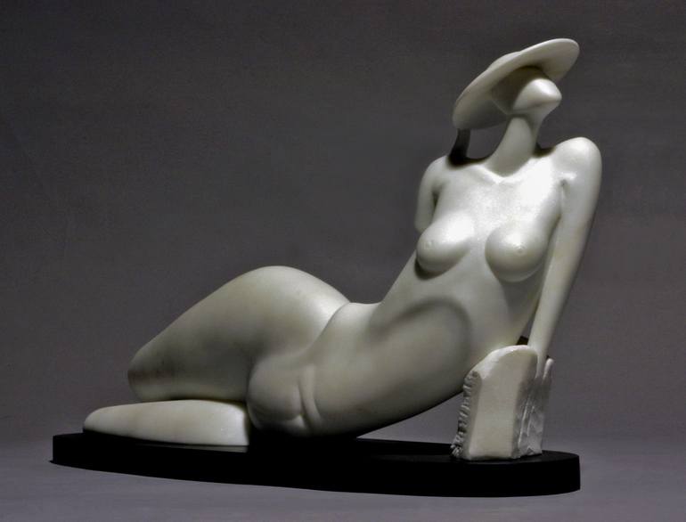 "L'ESTATE" This beautiful reclining nude is basking on a Riviera beach feeling the warmth of the noon sun, with only a wide brim hat to protect her. Carved from the finest Italian statuary marble,with a satin finish created with a razor sharp chisel,