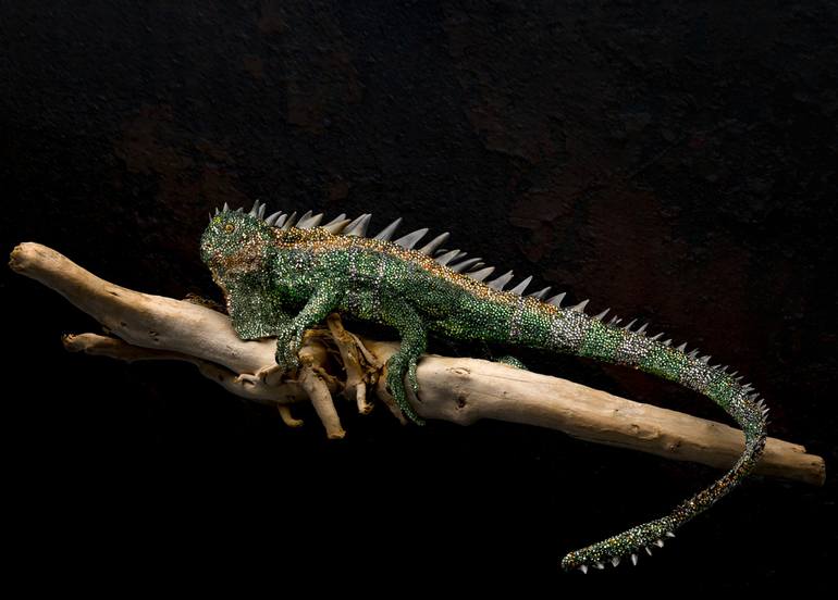Green iguana with shark teeth mounted on a tree root with 20.000 greenish color Swarovski Crystals. „The Grace of the Unknown “ is an art project by German artist MARINA DELLA PREDA. The artist created various creature sculptures by combining elements of different formerly living animals and thereb...