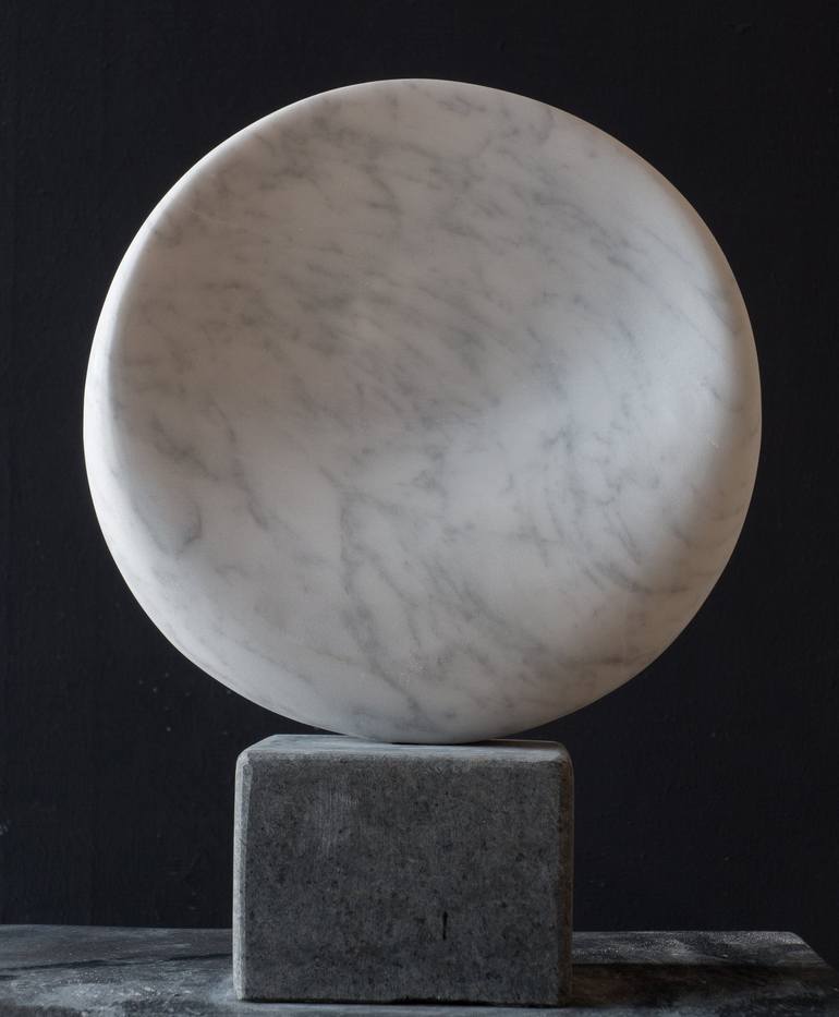 A sculpture from my sun and moon series, the concept of a moving sculpture. Although circular it does not roll, but makes a swinging motion. In one place, the marble is so thin that the light shines through it. The sculpture is unique and comes with a small stone base.