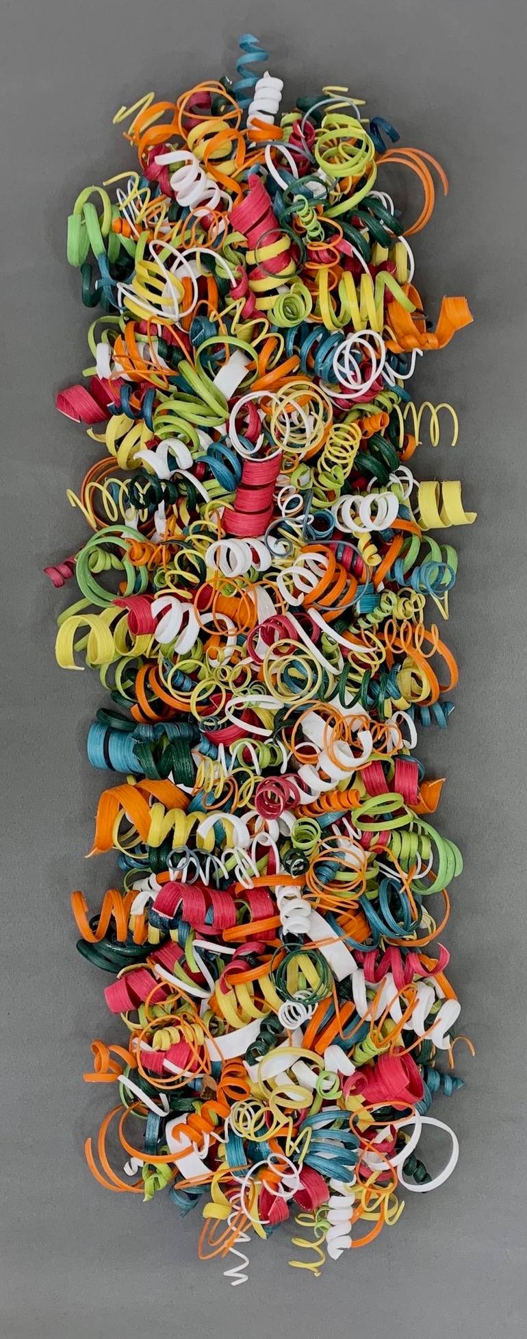 In this medium long and skinny sculpture, Karmin decided to use different tones of greens, teal, turquoise, orange, magenta, yellow, and white. It reminds her of a fresh Spring day and of the colors of flowers that are blooming. It will give any wall a fresh clean look. LOST and FOUND #88 is a happy...