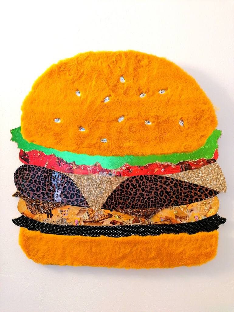 "LUXURY BURGER" collection 2021 BRILLIANT IDEA By EGO.ART.ZET This Burger is made of wood. The collage technique was used to create this artwork. The front surface is covered with many shiny rhinestones mimicking the luxury look of precious stones and black diamonds. Under lighting this artifici...