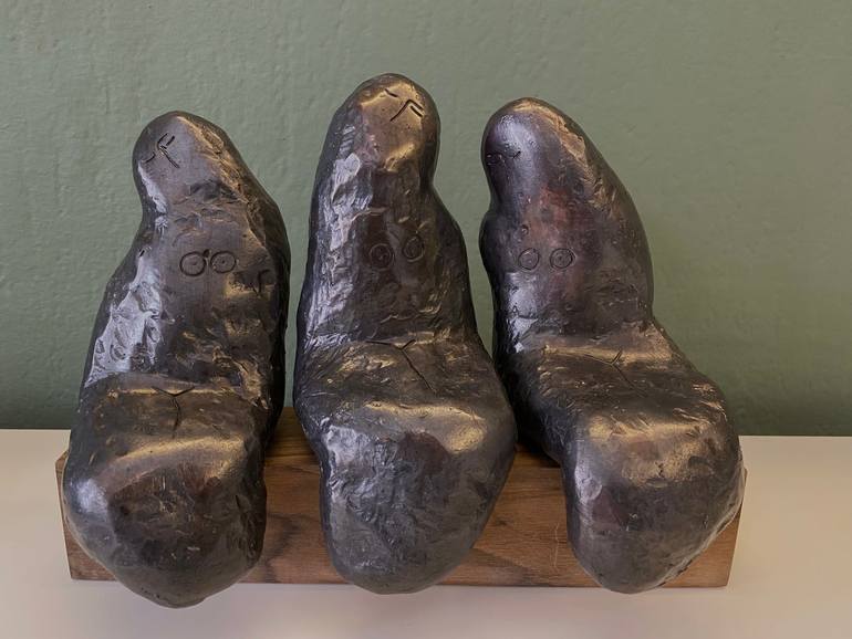 The sculpture depicts three ladies. Combination of bronze and walnut base. I stylized the images and hinted only with a silhouette. This sculptor will be made in only six copies. Each of them will be hand signed