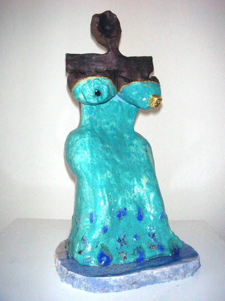 ENG: Polychrome ceramics and fused colored glass. Marble base. Nipple covered by 22 carats gold sheet. From "The Ladies with the golden nipple". ITA: Ceramica policroma e vetri colorati fusi. Base in marmo. Capezzolo in foglia d'oro 22 carati. Da "Le Signore dal capezzolo d'oro".