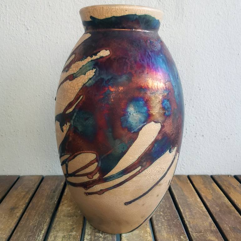 Large Oval 13.5 inches Raku Fired Ceramic Pottery Vase S/N0000608 Sculpture