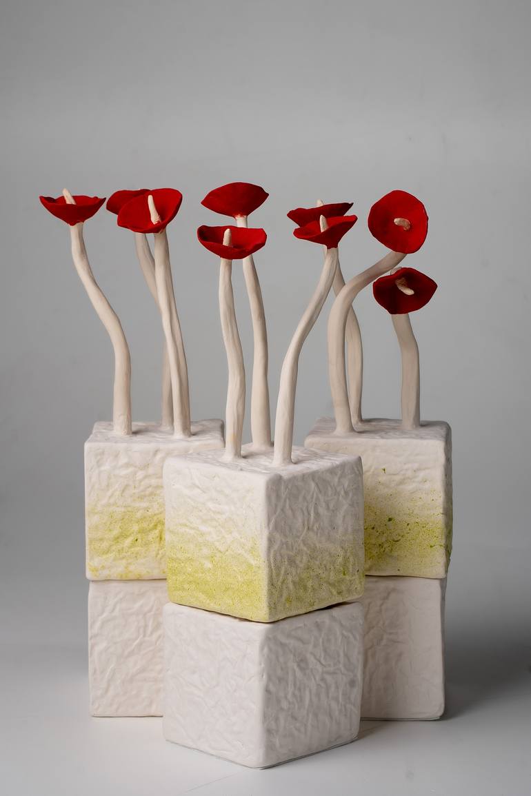 Several flowers bloom out of the solid cubes. The flower sculpted from Paper- matche and the cubes sculpted from clay